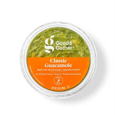 Make a crowd-pleasing contribution to your next office potluck or treat yourself to a serving of your favorite chip dip with a container of Classic Guacamole from Good & Gather™. Made with Hass avocados and flavored with jalapenos and garlic, this prepared guacamole dip offers all the classic flavor you crave without all the work, and it comes in a 10-ounce container so there’s plenty to go around. Pair it with hummus, tapenade and a variety of other dips and serve with chips for a quick appetizer, or add it to homemade burritos, tacos or veggie sandwiches. No matter how you serve it, this guacamole is sure to be a hit.