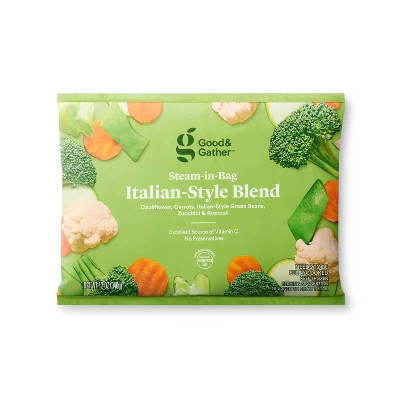 Complete any meal with the help of this Italian-Style Blend from Good & Gather™. Perfect for pairing with pasta, poultry, fish and more, this vegetable medley includes cauliflower, broccoli, carrots, Italian-style green beans and yellow squash for a variety of delicious flavors. You can easily whip up these veggies in a matter of minutes in the microwave with the easy steam-in-bag design, and it’s an excellent source of vitamin C. This frozen vegetable blend is great to have on hand in your freezer as a quick and easy side for a variety of meals.