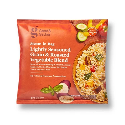 Put together a quick and tasty dinner in minutes with this 12-Ounce Frozen Lightly Seasoned Grain & Roasted Vegetable Blend from Good & Gather™. Made with seasoned bulgur, roasted zucchini, eggplant, candied tomatoes, red pepper, yellow pepper and onion, this frozen medley comes in a steam-in-bag and is ready in just minutes in the microwave. Great as a side dish, you can also add ground meat, tofu and more to make a tasty main course.