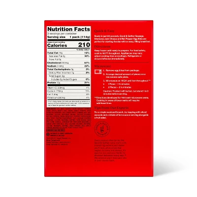 Great for enjoying alone or sharing, these Frozen Sausage, Monterey Jack Cheese, & Bell Pepper Egg Bites from Good & Gather™ are an easy, savory appetizer or meal option. Made with egg, Italian sausage, Monterey Jack cheese, red and green bell peppers, these bites have no artificial flavors or synthetic colors. Packed with 12 grams of protein per serving*, they’re ready after just 90 seconds in the microwave, making them ideal for busy days.