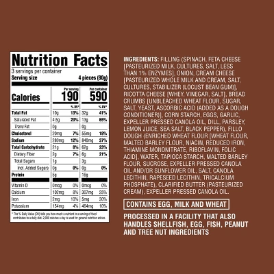 Enjoy a quick and easy savory snack when you keep Spanakopita from Good & Gather™ on hand. These delectable snack bites are a Greek-inspired blend of flavors, with rich feta and spinach housed in flaky phyllo cups for an easy-to-eat bite with just the right amount of crunch to offset the softness of the cheese and spinach. Made without artificial flavors or colors, you can enjoy the delicious taste of spinach and feta when you eat these Greek pastry bites. Heat them up and eat on their own as a snack, or serve as a side to a Greek-inspired dinner of lamb and stuffed grape leaves.