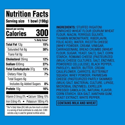 This Frozen Stuffed Mini Rigatoni with Butter Parmesan Sauce from Good & Gather™ is the perfect quick meal for hungry kids and families on the go. Made with ricotta and Romano cheeses, butter, cream, cauliflower , carrot and butternut squash. They feature 10 grams of protein per serving*, no artificial preservatives or flavors. Plus, the vegetables are hidden in the sauce for optimal flavor. Simply microwave until fully cooked.