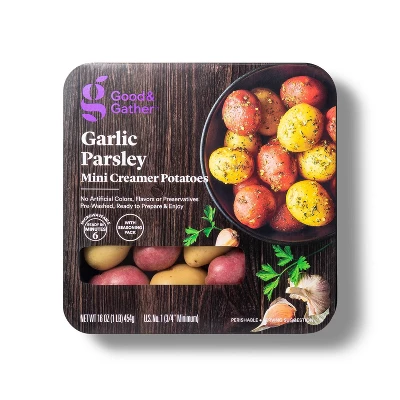 Prep and serve a delicious and simple side dish in no time with Garlic Parsley Mini Creamer Potatoes from Good & Gather™. This all-in-one potato side dish makes your life easier thanks to pre-washed mini red and gold potatoes that are ready to prepare and an included garlic and parsley seasoning pack. With no artificial colors, flavors or preservatives, they’re a tasty choice to serve alongside a wide variety of proteins and vegetables. Just follow the simple prep instructions, microwave to cook, and you’ll have a flavorful, savory side dish ready to go while you focus on other tasks.