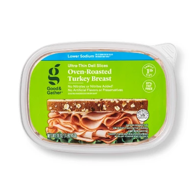 With Lower Sodium* Oven-Roasted Turkey Breast from Good & Gather™, you can get great oven-roasted flavor in your sandwiches, wraps and salads without all the sodium. This lower sodium* lunchmeat turkey contains 38% less sodium than our regular oven roasted turkey breast for a meat option you can feel good about. With added no nitrites or nitrates** and no artificial flavors or artificial preservatives***, you know exactly what you’re getting with this turkey and can feel confident serving it to your family. The turkey comes fully cooked and pre-sliced, helping to take some of the hassle out of meal prep — simply layer slices in between pieces of your favorite bread to create a tasty sandwich, or shred slices to mix into salads or omelets for a burst of flavor.