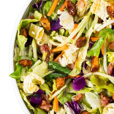 Whether you’re getting creative with your daily grab-and-go work lunch or serving up a tasty side dish for a family dinner, you’ll cherish the quick and easy flavor provided by the Maple Bourbon Bacon Chopped Salad Kit from Good & Gather™. This prepared salad mix includes romaine lettuce, shredded broccoli stalk, red cabbage, savoy cabbage, green onion, carrots, uncured bacon and golden honey almonds — it’s all finished off with maple bourbon vinaigrette, providing a hearty sweet and tasty savory salad option you and your family will love. Plus, it’s made without synthetic colors, artificial flavors or artificial preservatives. Serve it alongside anything from burgers to pasta salad for a versatile grocery pick.