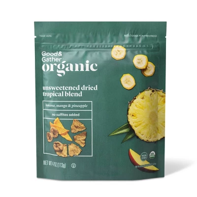 Take your sweet snacking game to the next level with this Organic Dried Unsweetened Pineapple, Mango and Banana Blend from Good & Gather™. The sweet taste of the banana and mango with pineapple is the combination you’ve been looking for, and with no added sugars or artificial flavors, it’s a choice you and your whole family can feel great about. This USDA organic dried fruit blend also has no GMOs or added sulfites. Create your own trail mix, add a sweet touch to packed lunches or bring along a tasty on-the-road snack on a busy day.