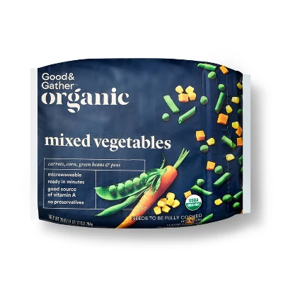 Add some veggies to your meals with ease with the 28-Ounce Organic Frozen Mixed Vegetables from Good & Gather™. These mixed vegetables are a good source of Vitamin A, and they make a quick side dish or a tasty addition to rice or pasta dishes. Microwaveable for easy prep, they’re USDA Organic and preservative free.