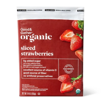 Add a little sweetness to your life with a package of Organic Frozen Strawberries from Good & Gather™. An excellent source of vitamin C and a good source of dietary fiber, these delicious strawberries make a great addition to your morning smoothie. Blend them up with spinach, bananas, mangos and blueberries for a tasty way to start the day, or serve them thawed with a dollop of whipped cream for a light dessert you’ll feel good about. The reclosable package helps you keep this frozen fruit tasting its best, and with no sugar added, it’s a premium snack you can feel good about.