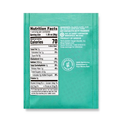 Enjoy a tasty little snack or add a burst of flavor to your meals with these Pitted Kalamata Olives from Good & Gather™. These pitted Greek olives are great for snacking, accompanying drinks, topping salads and more. With no artificial colors or preservatives added, these delicious ready-to-eat kalamata olives provide an exciting boost of flavor. Whether you eat them plain, drop one into a martini, or add to salad, pasta and other dishes, you’re sure to enjoy the authentic taste of these pitted Greek olives.