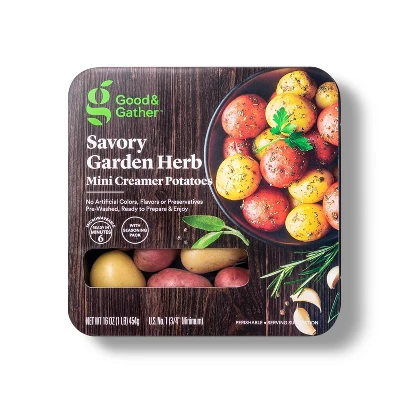 Add a delicious side dish to your meals with the 16-Ounce Savory Garden Herb Mini Creamer Potatoes from Good & Gather™. This savory potato side dish features mini red and gold potatoes that you can easily prepare in the microwave. Add butter or olive oil and the herb seasoning for a mouth-watering side that pairs wonderfully with salmon, steak or grilled chicken. The potatoes are pre-washed and contain no artificial colors, flavors or preservatives so you can enjoy them hassle-free. However you choose to enjoy them, these creamy mini potatoes are a convenient way to liven up any meal.