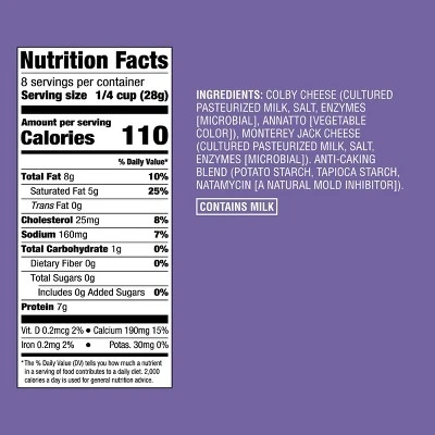Shredded Colby Jack Cheese from Good & Gather™ can serve a variety of purposes in your kitchen, from topping off Cobb salads to adding some cheesy texture to your morning scrambled eggs. This colby Jack shredded cheese has a mellow yet tasty flavor that makes it a delicious addition to virtually any dish without detracting from the dish’s core flavors. Sprinkle some on top of tortilla chips with shredded chicken, black beans and rice for mild nachos, or add some to cooked veggies to satisfy pickier eaters. Either way, you’ll appreciate that it’s a good source of calcium*, and the reclosable package will help keep it fresh between uses.