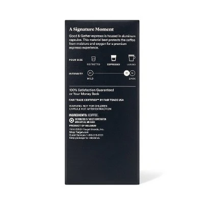 Good & Gather™ Signature Altissimo Intenso Espresso Capsules have a full body that’s great for a classic espresso pour, cappuccino or latte in the comfort of your home. Blended using Fair Trade certified robusta and Arabica coffee beans from Asia and South America, these dark roast espresso capsules are compatible with the original line of Nespresso machines and feature a zesty citrus and candied spice flavor. With a full body and bold finish, these dark and versatile at-home espresso pods can be enjoyed on their own or paired with your favorite frothed milk and brown sugar for a powerful cappuccino to start your day off right. Every product that carries the Good & Gather™ name starts with quality ingredients that deliver great taste, making it easier for you and your family to eat well, every day. We promise you’ll love each bite, or your money back. To ensure products are made with respect to both people and the planet, Fair Trade has created strict standards that promote safe, healthy working conditions, protect the environment and benefit farmers and workers through additional funds and community development.
