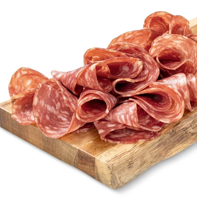 This Signature Italian Uncured Sopressata Salami from Good & Gather™ is sure to be a new staple in your refrigerator. Not preserved keep refrigerated below 40F at all times. Uncured and made with no artificial flavors or synthetic colors, this delicious sopressata salami has no nitrates or nitrites added except for those naturally occurring in celery juice powder and salt. Produced in Italy, sliced and packaged in the USA, you can enjoy it as a solo snack or add some to sandwiches or charcuterie boards.