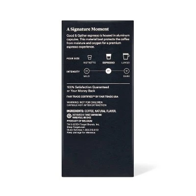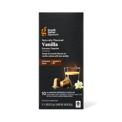 Good & Gather™ Signature Naturally Flavored Vanilla Espresso Capsules are great for a classic espresso pour, cappuccino or latte in the comfort of your home. Blended using Fair Trade certified robusta and Arabica coffee beans from Asia and South and Central America, these medium roast kosher espresso capsules are compatible with the original line of Nespresso machines and feature a naturally sweet vanilla flavor and aroma. With low acidity and a smooth finish, these vanilla flavored at-home espresso pods can be enjoyed on their own or paired with frothed milk and a drizzle of caramel for a delicious mid-morning treat. Every product that carries the Good & Gather™ name starts with quality ingredients that deliver great taste, making it easier for you and your family to eat well, every day. We promise you’ll love each bite, or your money back. To ensure products are made with respect to both people and the planet, Fair Trade has created strict standards that promote safe, healthy working conditions, protect the environment and benefit farmers and workers through additional funds and community development.