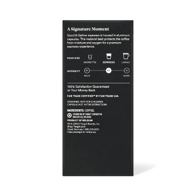 Good & Gather™ Signature Colombian Espresso Capsules have a silky body that’s great for a classic espresso, cappuccino or latte in the comfort of your home. Blended using Fair Trade certified Arabica coffee beans from Colombia, these kosher espresso capsules are compatible with the original line of Nespresso machines and have a balanced blend of stone fruit and graham cracker notes. With a light body and smooth finish, these versatile at-home espresso pods can be enjoyed over warmed whole milk and sugar for an at-home macchiato or stirred with almond milk and ice for a non-dairy alternative to a traditional iced latte. Every product that carries the Good & Gather™ name starts with quality ingredients that deliver great taste, making it easier for you and your family to eat well, every day. We promise you’ll love each bite, or your money back. To ensure products are made with respect to both people and the planet, Fair Trade has created strict standards that promote safe, healthy working conditions, protect the environment and benefit farmers and workers through additional funds and community development.