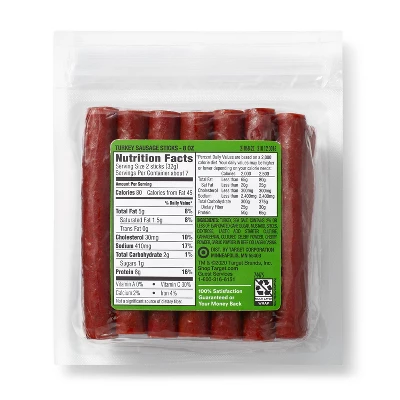 These savory and satisfying Turkey Sausage Snack Sticks from Good & Gather™ are the perfect choice for a grab-and-go snack you can munch on when you get hungry at work or out and about running errands. Smoked for delicious, savory flavor, they pair nicely with cheese for use on a charcuterie board at your next party or social gathering. These turkey sausage snacks are also ready to eat so you can take them anywhere for a quick, appetizing bite you won’t have to worry about preparing.