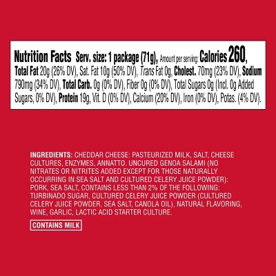 Take a tasty snack on the go with this 2.5-Ounce Uncured Genoa Salami and Cheddar Cheese Snacker from Good & Gather™. This snacker features uncured Genoa salami and cheddar cheese made with no artificial flavors, no synthetic colors and no nitrates or nitrites added except those naturally occurring in sea salt and cultured celery juice powder. Perfect for traveling, long commutes, school lunches and more, each pack contains 19 grams of protein.