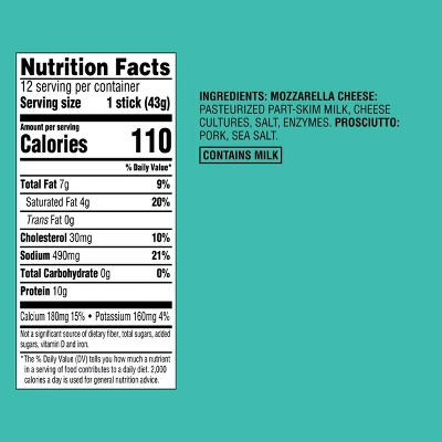 Enjoy a delicious bite of savory and creamy goodness when you snack on a Wrapped Prosciutto and Mozzarella Cheese Stick from Good & Gather™. This individually wrapped snack features delicious mozzarella cheese wrapped up in thin, savory prosciutto for a satisfying snack you can enjoy at home or on the go. Plus, it’s made with no artificial flavors, no synthetic colors, and no nitrates or nitrites added except those naturally occurring in sea salt and cultured celery juice powder. Enjoy one anywhere for the flavors of your charcuterie favorites in convenient ready-to-eat form.